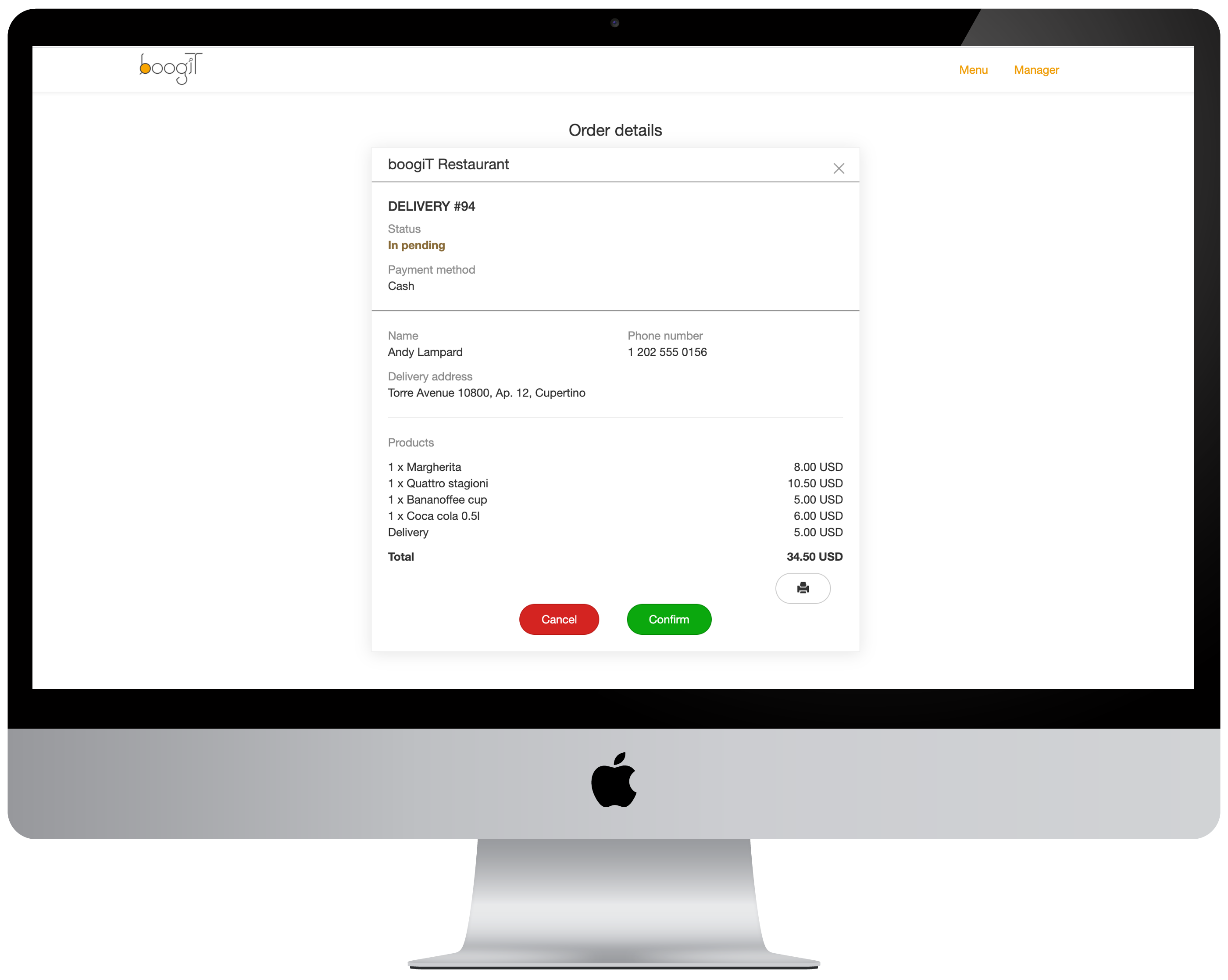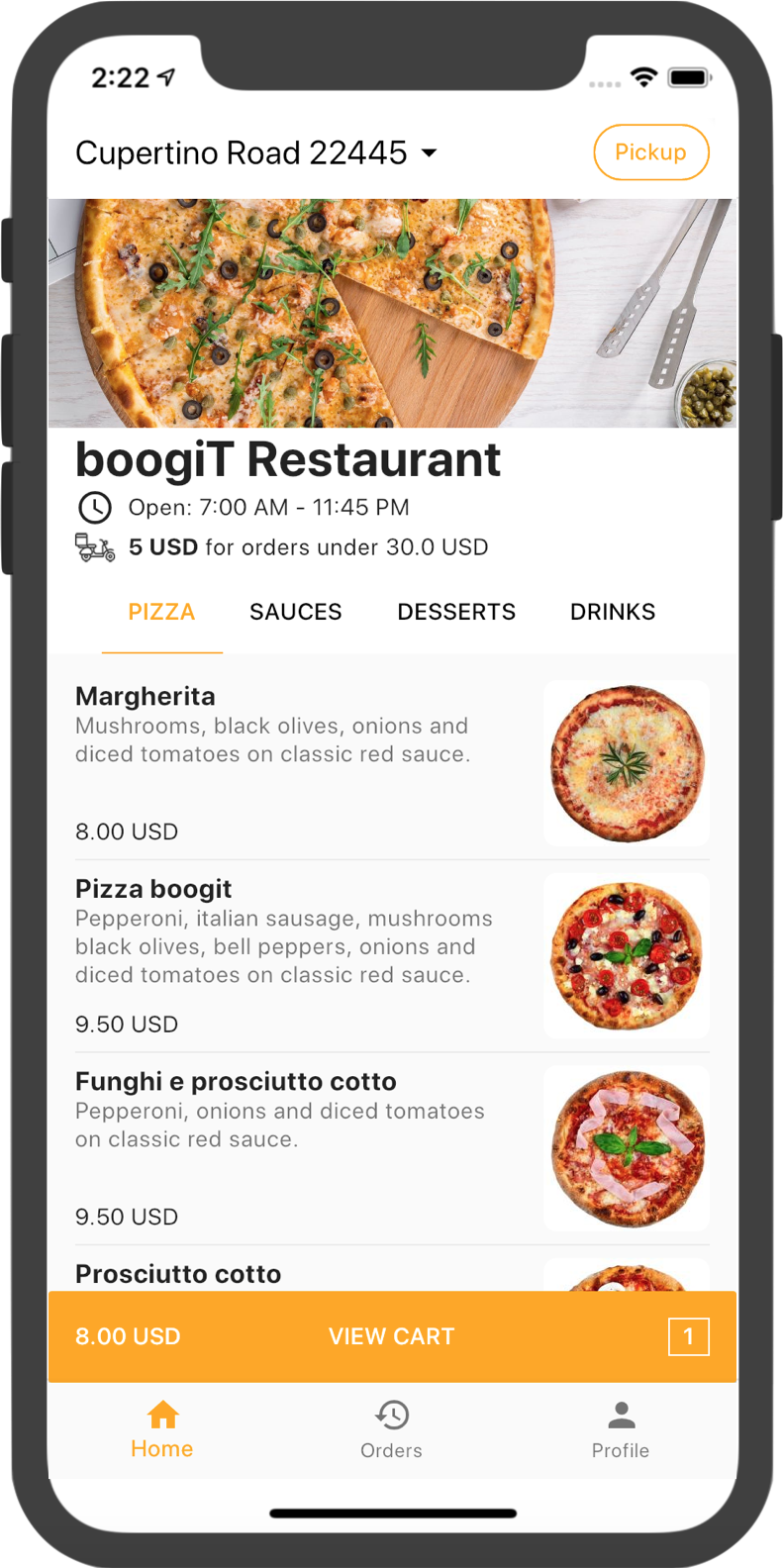 Aplicatia boogiT Shop permite clientilor sa plaseze comenzi online prin intermediul aplicatiilor Android, iOS sau Web. Solutia este integrata cu sistemul boogiT PoS si boogiT Delivery, astfel comenzile primite vor ajunge direct pe ecranele din bucatarie pentru a putea fi pregatite, respectiv in aplicatia curierilor.