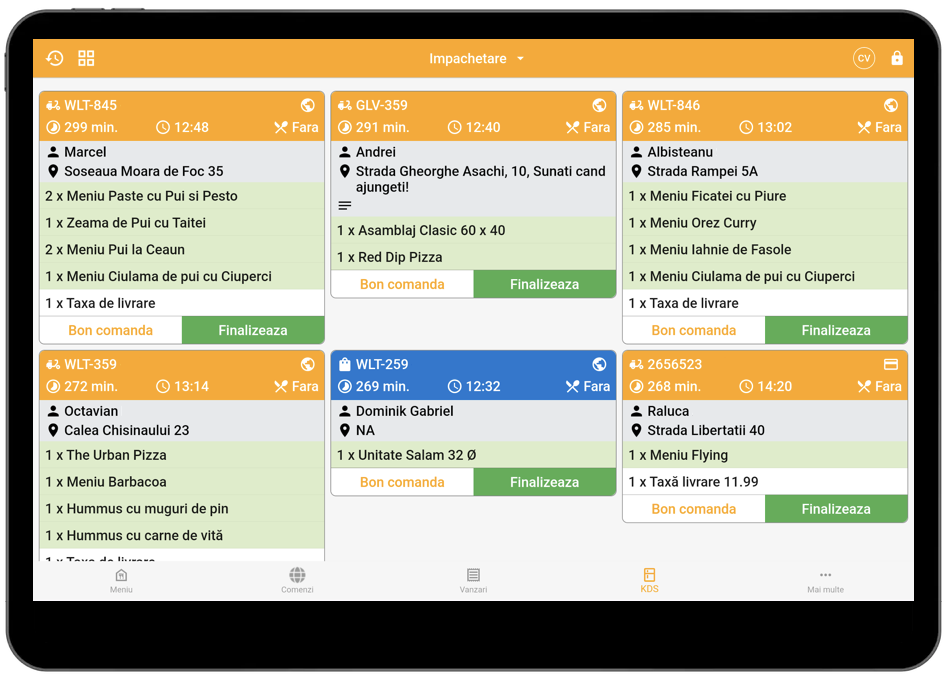 • Fiecare comanda are marcaj de timp, astfel incat personalul poate urmari durata de preparare si poate prioritiza comenzile.